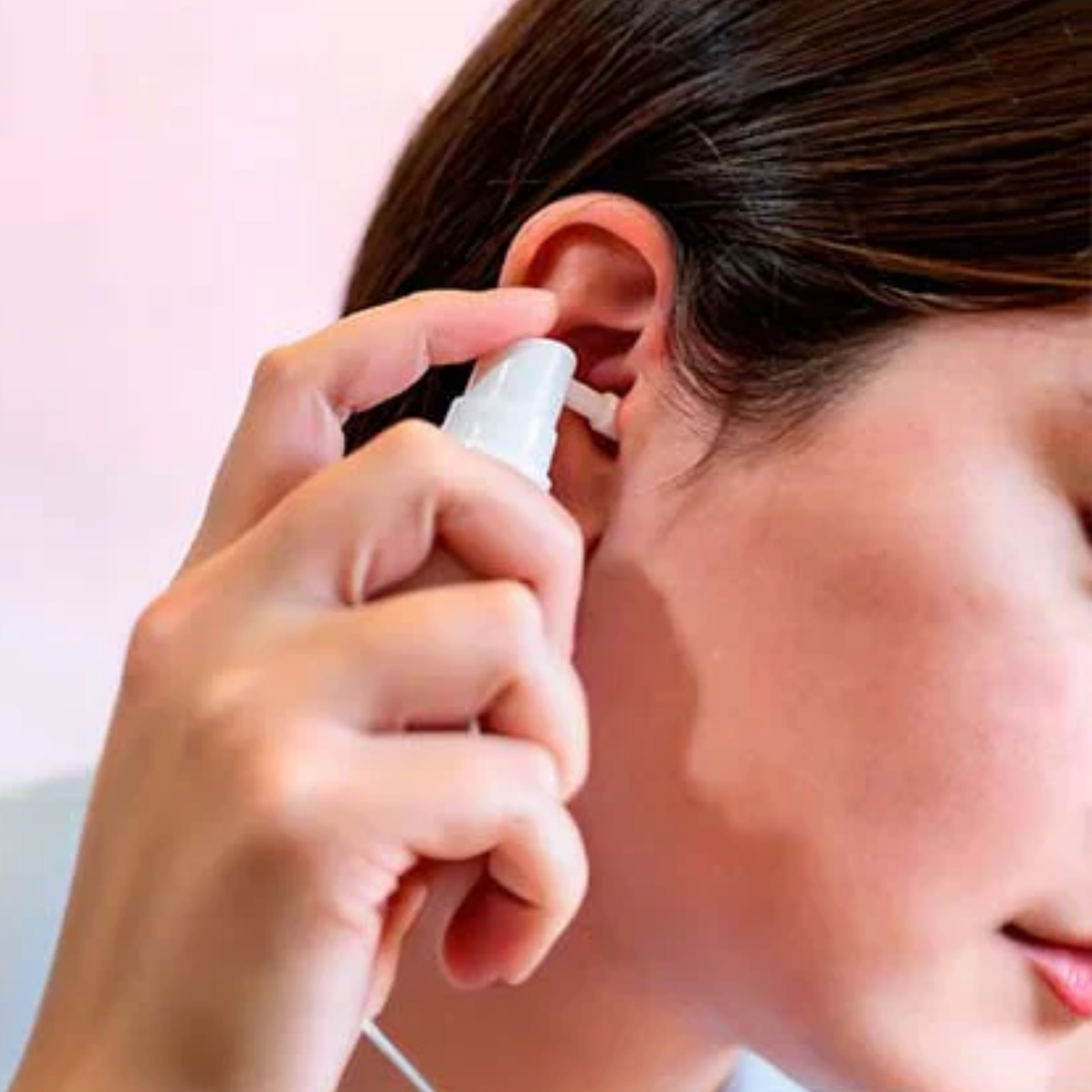 Agita el frasco y aplica 2–3 sprays en cada oído.
