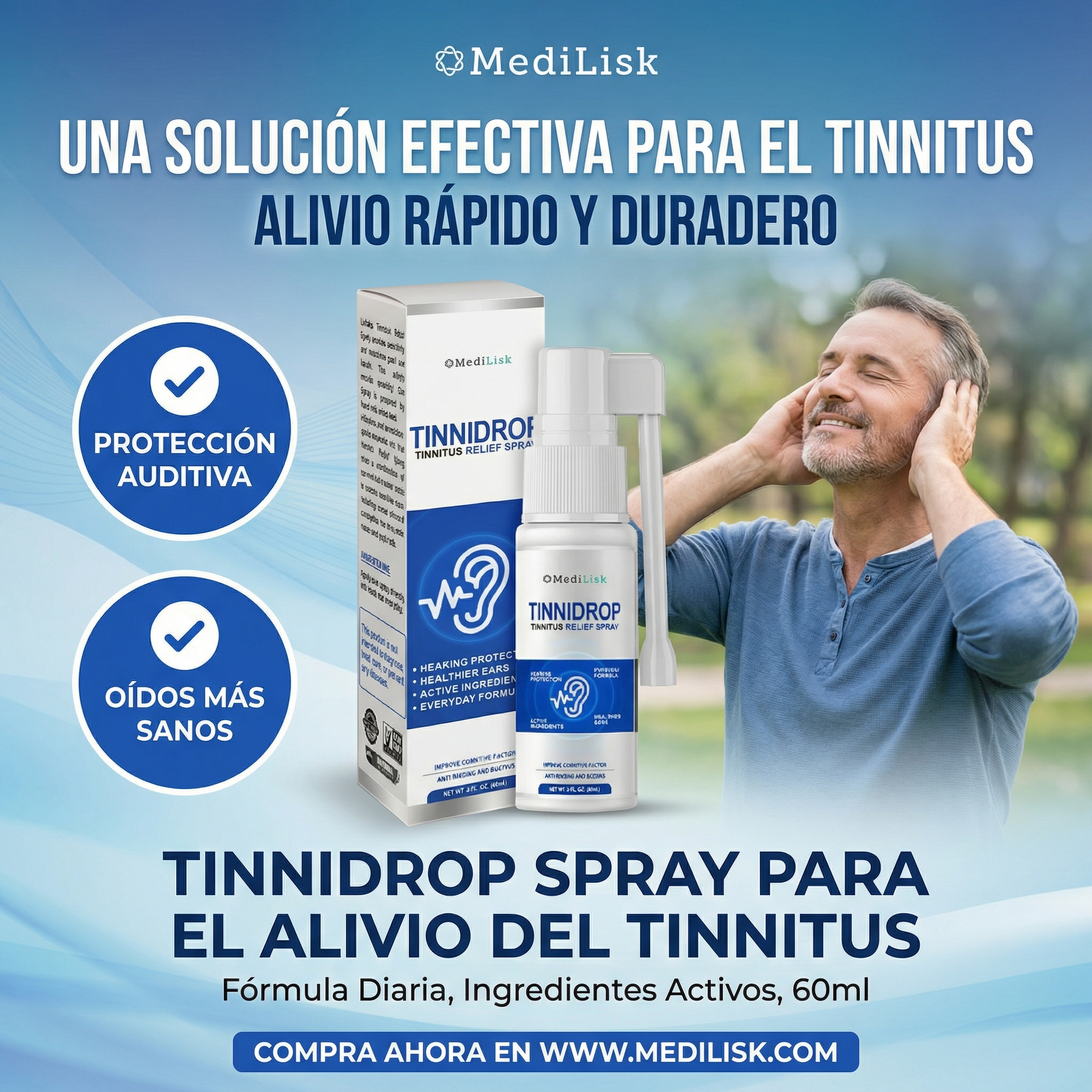 Tinnidrop Spray actúa directamente en el origen del problema para ayudarte a recuperar la calma, el silencio y tu bienestar diario.